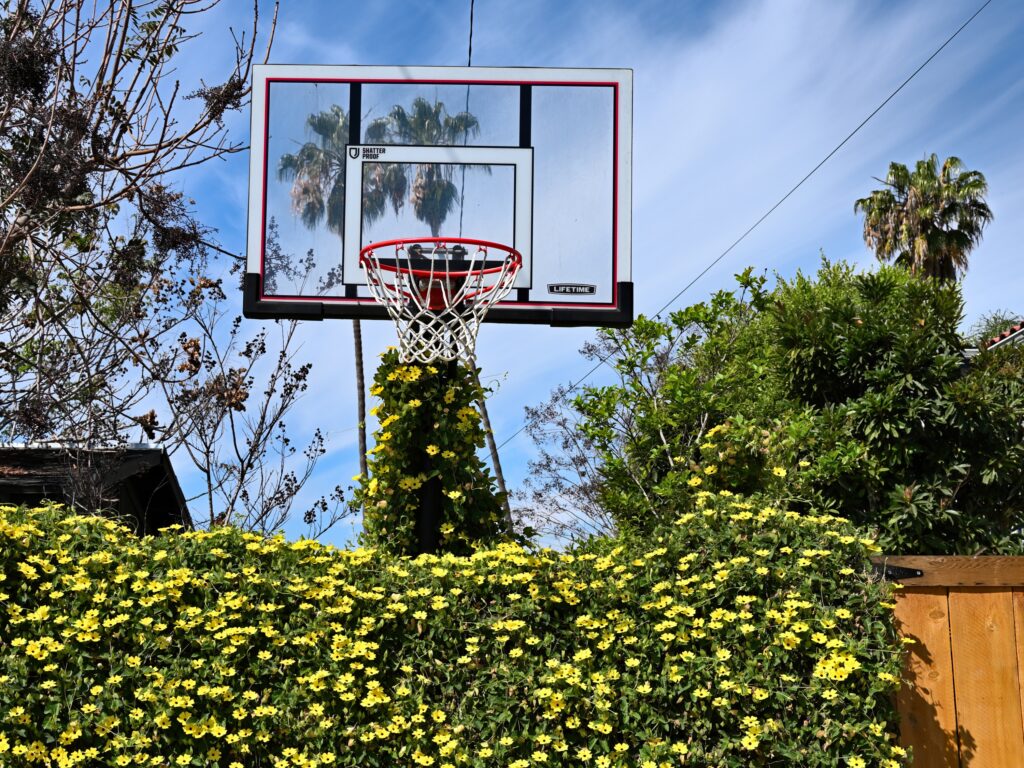The answer could be nobody. I haven’t seen any signs of activity around this hoop recently, which could mean something else: No aspiring basketball players live nearby, and that would easily explain how the vine climbed so high.