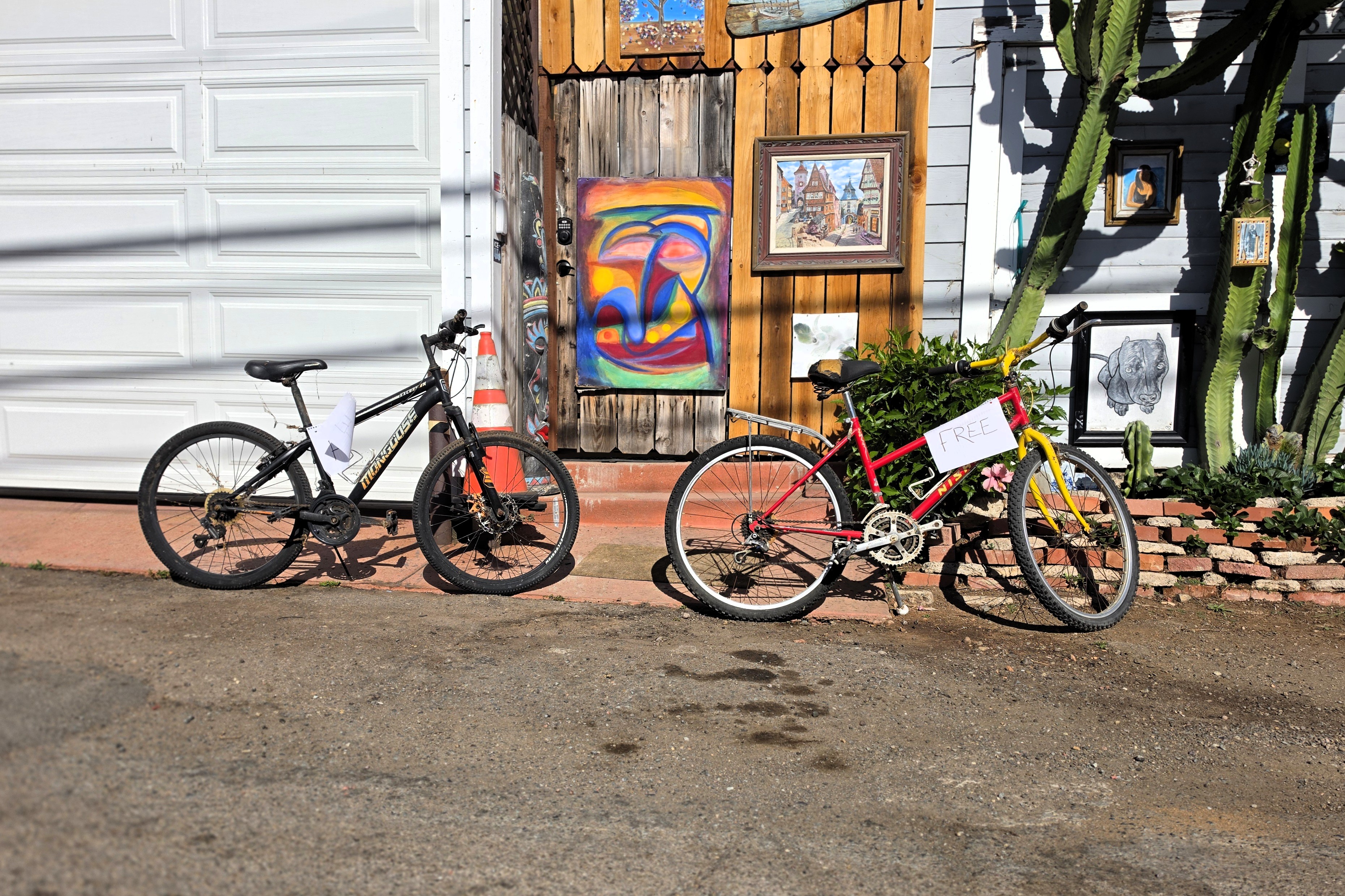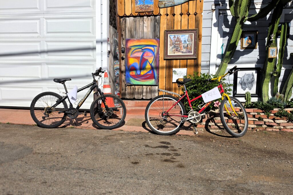 On April 8, 2026, in front of the artwork, I passed by two bicycles put out for the taking. These aren’t the first free bikes to appear in a neighborhood alley—one person’s throwaway becoming valued takeaway for somebody else.